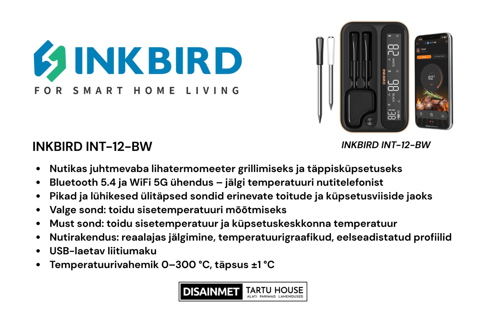 INKBIRD nutikas juhtmevaba lihatermomeeter on loodud eelkõige grillimise ja täppisküpsetuse entusiastidele. Seade ühendub nutitelefoniga Bluetooth 5.4 või WiFi 5G kaudu ning võimaldab kasutada nii pikki kui ka lühikesi ülitäpseid sonde vastavalt valmistatava toidu suurusele, paksusele, küpsetusajale ja -meetodile.